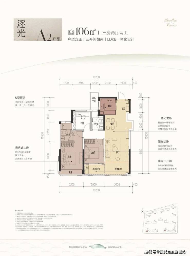 建面约106方A户型,三房两厅两卫: