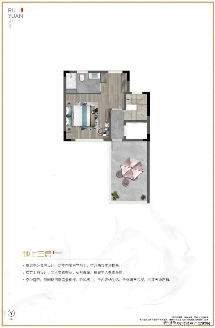 三楼整层主卧套房设计,带空中庭院。当夏天的时候约几个朋友在庭院上喝喝茶,或者约几个朋友吃吃烧烤,喝喝啤酒,让您真正感受到人生的惬意和人与自然共呼吸的美好生活。
