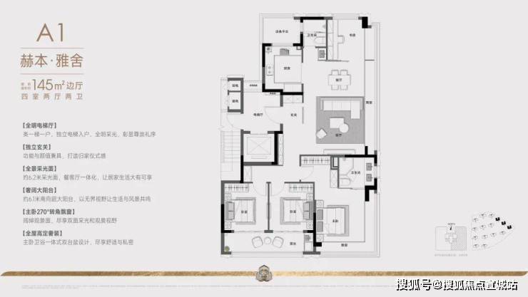 建面约145㎡的户型:项目采用创新的"两梯两户"设计,通过巧妙的空间规划实现类一梯一户的尊享体验。双电梯厅以防火门分隔,确保住户私密性。专属电梯直达户门,10平方米的270度转角入户花园,兼具采光通风优势,将功能性与仪式感完美结合。