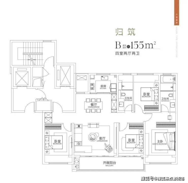 155户型也是2梯2户设计,做了4房2厅2卫.户型格局与183户型差别不大,相当于是缩小版.南向面宽14.9米,客厅开间5米,阳台宽8米.