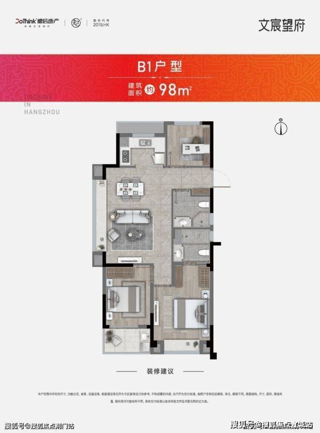 在建面约98方的中间套户型中,文宸望府采用了三开间朝南的设计,媲美市场上建面约120方以上的大户型。
