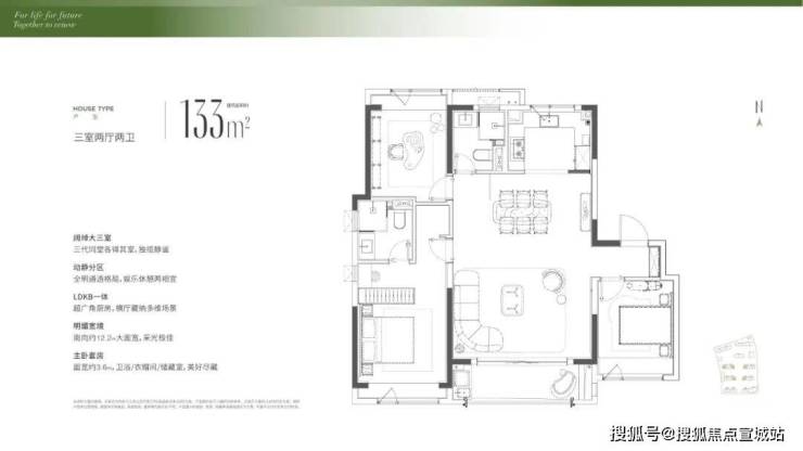 建面约133㎡的3房户型,空间尺度奢阔,足以媲美内环豪宅。