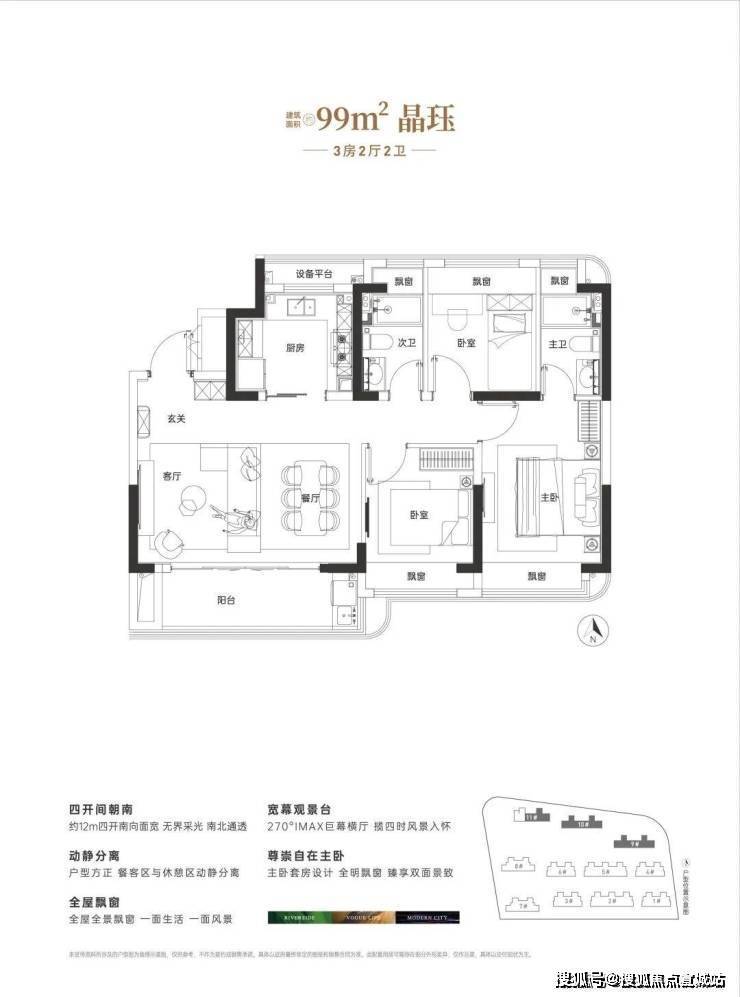 四开间朝南+超大宽景阳台、全屋飘窗大尺寸窗户比,这个户型的尺度感和采光面堪比别墅。但这仅仅只是一个建面约99㎡的3房2卫。