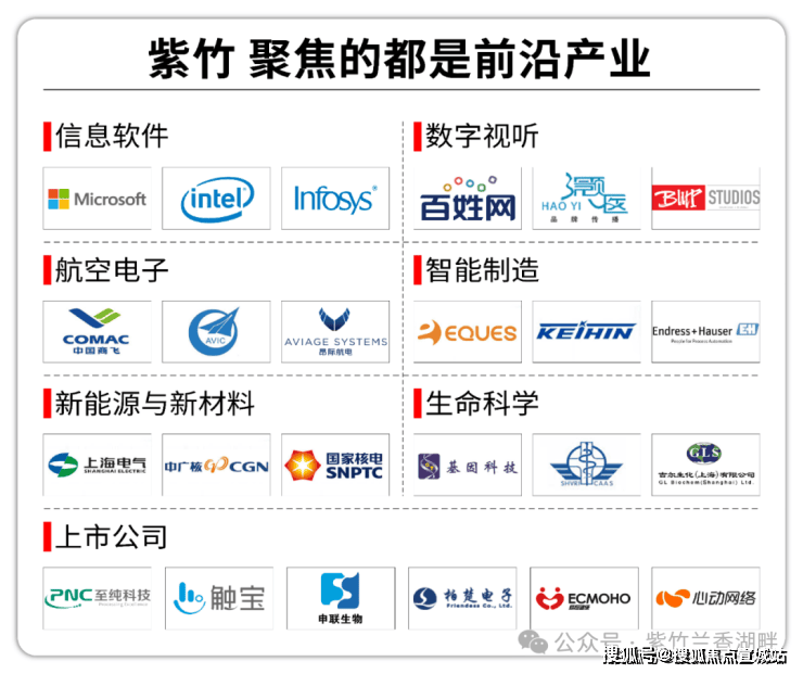 紫竹聚焦“集成电路与软件、新能源、航空航天、智能制造、数字视听、生命科学”六大前沿赛道, 微软、英特尔、可口可乐、晟碟半导体、 印孚瑟斯技术、东软集团、 中国商飞等都多家世界500强进驻。