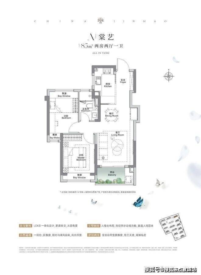上海宝山金茂棠前营销中心热线400--8862-334(官方预约热线)建面约85㎡2房2厅1卫,做到了双开间朝南+3个飘窗+LDKB一体化设计,附加空间非常多。