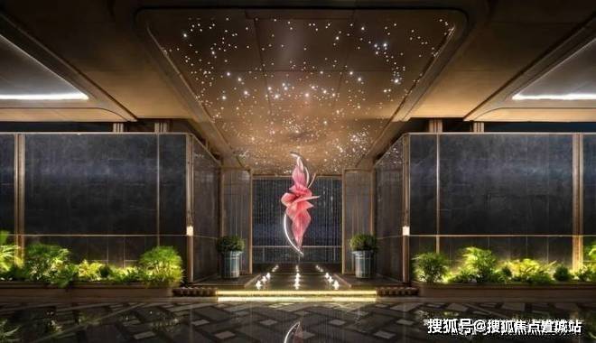 5、悬瀑垂幕水景,视听顶级双重享受下沉式环幕庭院,跌水景观环绕,池底仿黑金砂与宝石晶片闪烁,点缀百余灯珠,师法“琉璃水光”形意,糅合视听五感,打造全浸式立体园境,天工巧夺,嘉定未见。