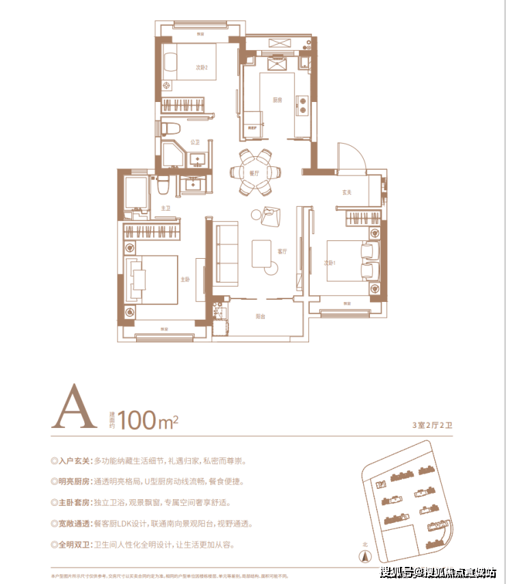 100㎡三房两厅两卫:得房率约 78%,三开间朝南,客厅面宽约 3.8 米,主卧面积约 16㎡,带独立卫生间和大飘窗。