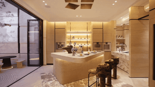 空间中没有冗余的符号,每一个细节都经过精心考量,既满足当代生活需求,又延续了海派文化的精神内核。嘉格纳蒸汽烤箱、真空抽屉组合隐于柜体秩序,与同侧咖啡机呼应。暖木色泽与大理石细腻纹路交织,勾勒出厨间的宁静气韵。