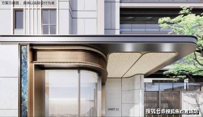 上海浦东招商臻境售楼处电话☎:400-8828-814(售楼处预约看房热线)在楼栋主入口同样运用石材+弧形铝板等元素,同时还有格栅装饰,质感提升明显:
