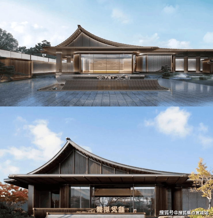 建筑风格:现代东方风格外立面,搭配江南园林景观示范区