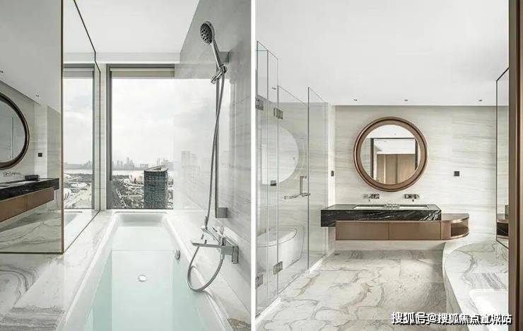 杭州壹号院主卫以优雅的白色大理石铺装而成,纵向延申的浴缸可以俯瞰整个奥体板块以及钱江新城。位于浴缸左侧的柱子在设计师的改造下变成通透镜面,反射城市景观,夜幕降临,城市灯光与霓虹一览无余。