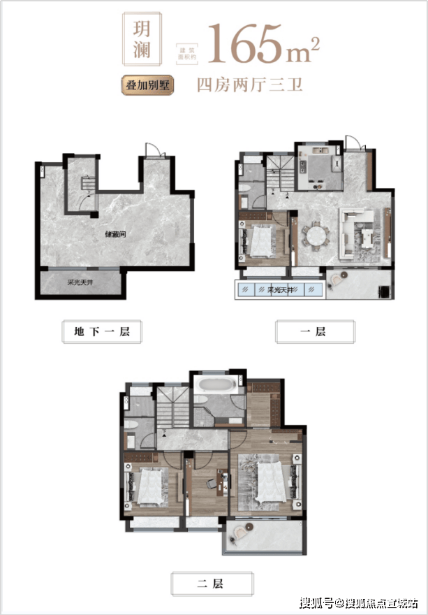 叠墅(155-165㎡四房):上下叠设计,下叠带花园,上叠配露台,四房三卫,适配多代同堂。