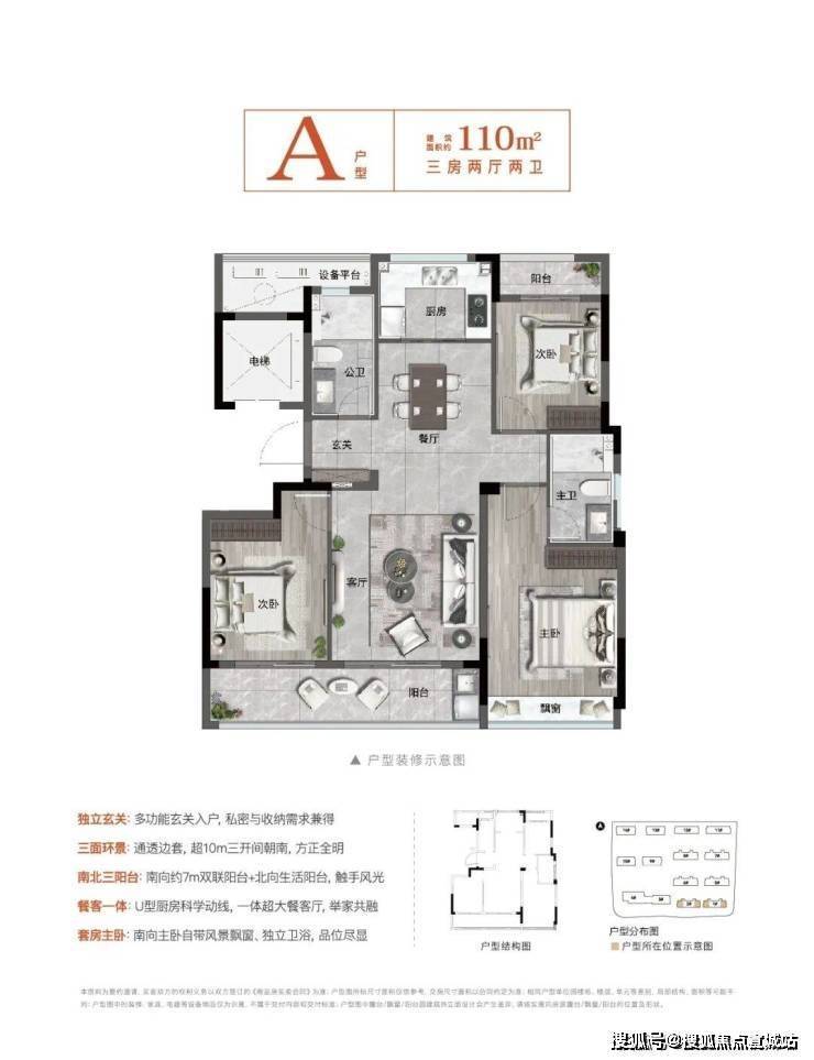 约110㎡户型点评:独立玄关:多功能玄关入户私密与收纳需求兼得,三面环景:通透边套,超10m三开间朝南,方正全明,南北三阳台:南向约7双联阳台+北向生活阳台,触手风光,餐客一体:U型厨房科学动线,一体超大餐客厅,举家共融,套房主卧:南向主卧自带风景飘窗、独立卫浴,品位尽显