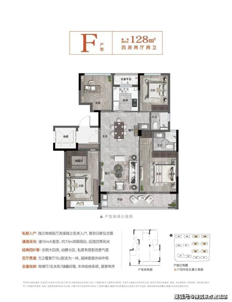 约135㎡户型点评:独立门厅:独立电梯前厅连接独立玄关入户尽显归家礼仪风尚,经典四叶草:奢阔大四房,分散式布局,私密有度彰大宅气度,尊崇双套房:南向卧皆配独立卫浴,同面积段产品,板块祗此,迭代三卫:创领超配设计,隐私主卫,体面客卫,定义富春新改善,环幕通透:三面采光,方正格局,约7.5m巨幕阳台盛载阳光