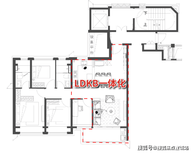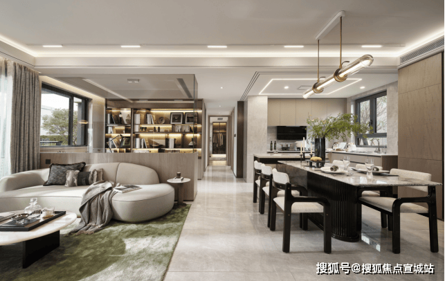 LDKB一体化的设计,将客餐厅、厨房融为一体,打破空间便捷的同时,尽可能地提升公区的空间使用率,尺度感超强,可轻松承载会客、家庭聚会、生日派对等场景。