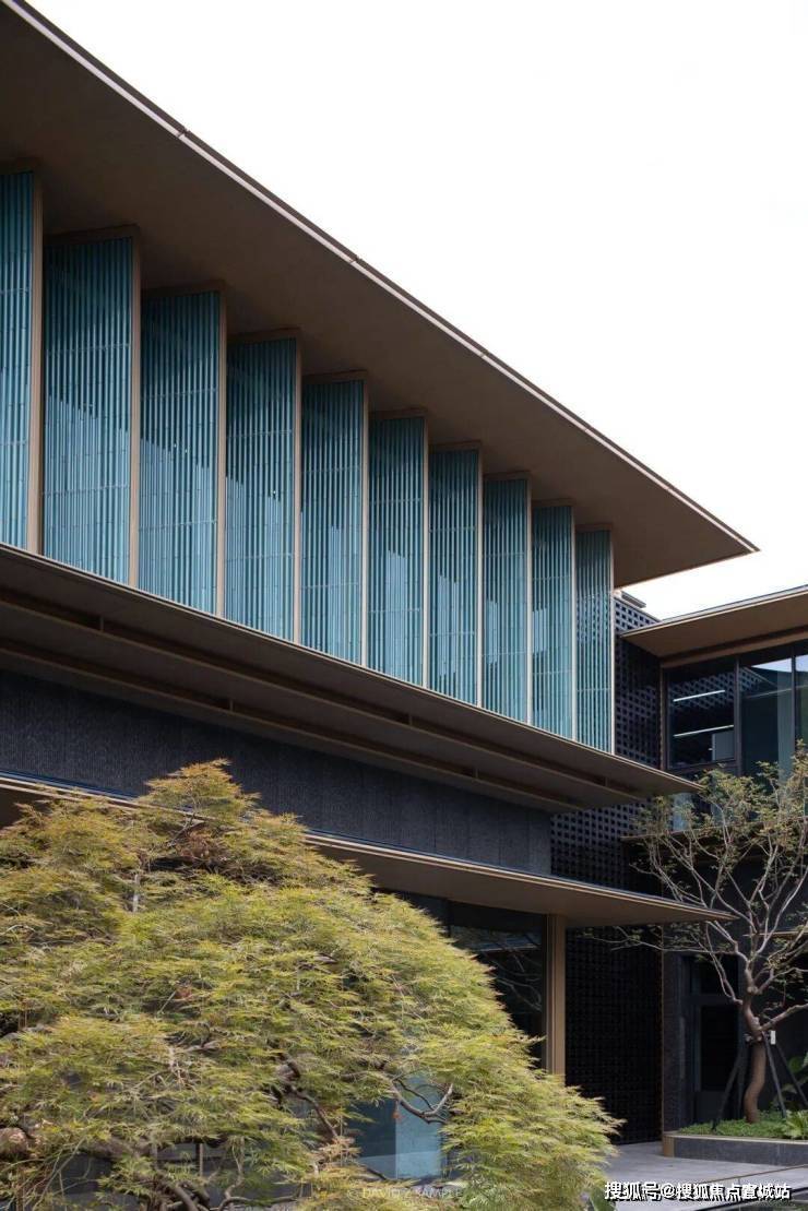 在立面打造上,樾青岚提炼飞檐、斗拱、引檐、直棂窗等宋代建筑细节,融揉现代审美工艺,重塑东方的当代表达;提取宋画中的线条感,通过局部铝线条的运用,融合巨幕灰蓝色玻璃,让建筑隐于自然,如画框一般,呈映天光云影。