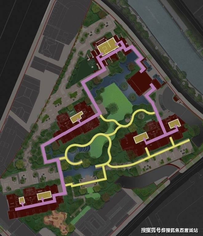社区约3000㎡的中心花园和6大艺术花园,不仅让每栋楼都享受“楼王”的待遇,且自然勾勒出一条漫游式的公园归家动线(黄色线条走向)