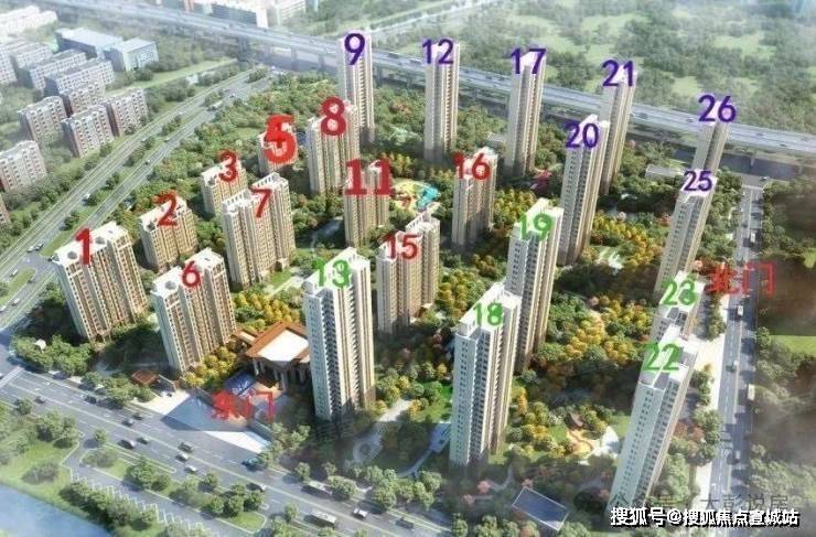物业类型:有3幢是9F洋房,有7幢是17F小高层,有12幢是22F/26F高层,共计22幢楼,红色数字楼栋为一期产品,紫色数字楼栋为二期产品,绿色为三期产品
