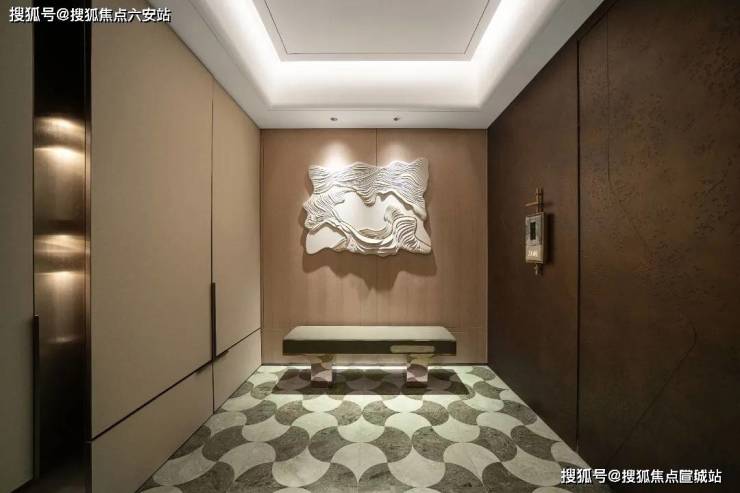主卧的锤纹门把手、地板花瓣拼、镂花的空调出风口每一个都是世界级的工艺。同样,精装的用材也很考究,从电梯厅到室内各种奢材在这里齐聚,瑞士翡翠、白雪公主、蒂芙尼绿、巴黎金等奢石,还有仿锤纹夹丝玻璃、仿古锈镜、隐木这些罕见用材增添艺术质感。