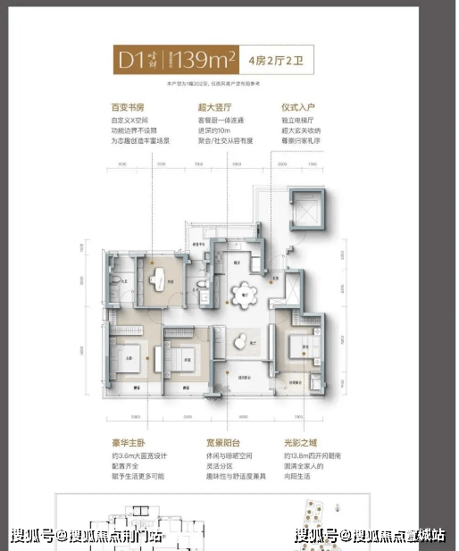 户型特点:部分户型如105㎡南向采光超10米,109㎡、139㎡和169㎡设计成四开间朝南,169㎡户型甚至达到五朝南,南向开间达17.3米。