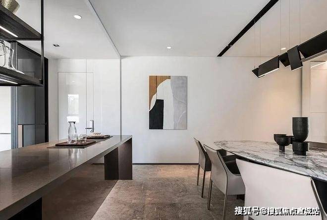 开放式厨房,一体化联动至餐厅,岛台台面为岩板,巧妙地与餐厅融为一体。