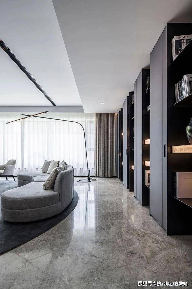 客厅大面积的书墙除了造型层面之外,更加赋予空间产生在人文方面的强烈气息。