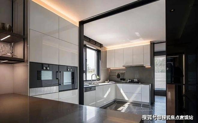 贪吃蛇收纳,在分户墙处增设“凹型空间",“冰箱外移"增加厨房操作台面和收纳空间,创造更合理的餐厨桌台动线。