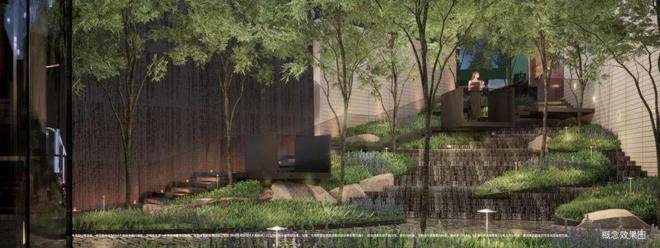 第二重归家礼序:步入社区,首入眼帘的是6米高水幕的下沉式山水庭院,这也是未来实景示范区的开放区域的所在。