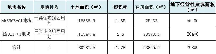 hk356B-01地块为一类住宅组团用地,土地面积18838.5㎡,容积率1.35;hk311-01地块为三类住宅组团用地,100%全装修,土地面积11349.4㎡,容积率2.5。