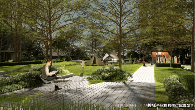温润木质的瞭望台、微度假卡包空间、条石分割的秩序草阶组团呈现多功能共享空间,主题聚餐、生日 Party、户外影院、演艺活动……满足全龄段业主潮流追求