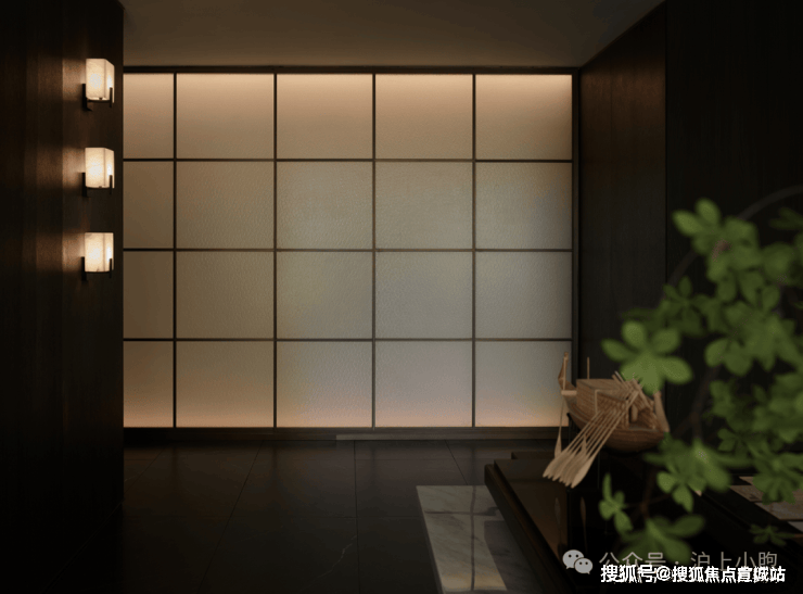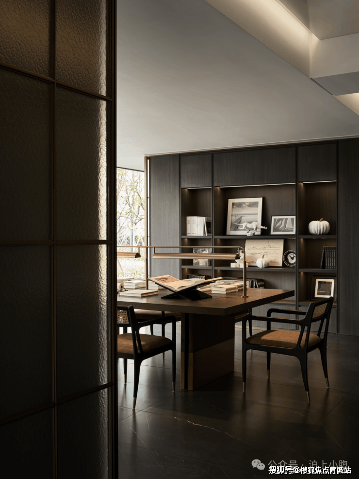 深色的木饰面与玻璃屏风的结合,木作与哑光金属的衔接,丰富材质的触感,温馨的灯光照映下,整体的材质色彩搭配,令空间底色是如此的静雅。