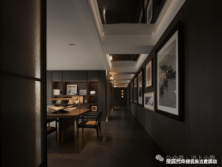 过道一侧深色木饰面的包裹将立面塑造成干净的基底,未来可以承载绘画、手作、书法等各类文创作品。