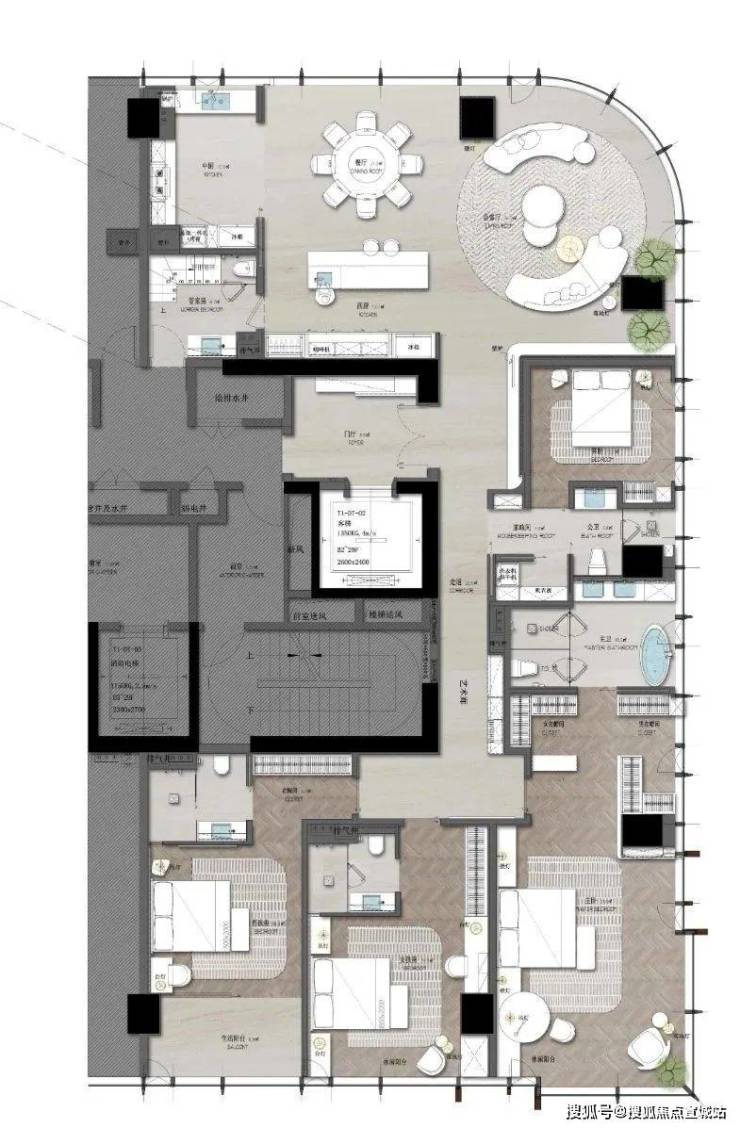 总户数:T1/T2塔楼共98套(370-1080㎡)