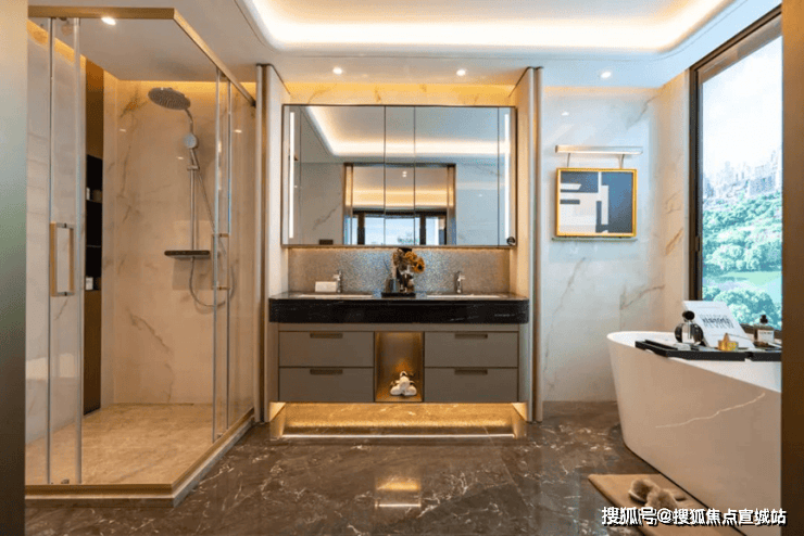 卧室墙面采用局部墙布+局部硬包,地面是书香门地实木复合地板铺就。样板间实景图卫生间甄选唯宝的台下盆、汉斯格雅的龙头+恒温花酒,玫瑰岛的淋浴房,科勒的智能一体马桶+浴缸+浴缸龙头等,生活质感肉眼可见。更有众多人性化细节,包括加热毛巾架,淋浴屏,定制台盆柜+镜柜等,省去后期定制比价的烦恼。
