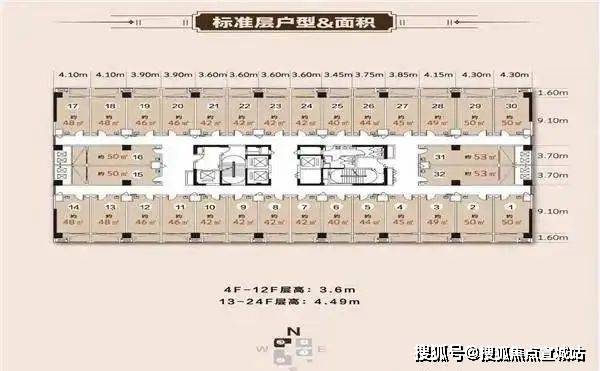 3号楼创客空间4-12楼层高3.6米13-24楼层高4.49米挑高;建面40-53㎡;总价53-90万单价在1.4-1.7左右