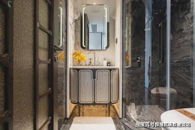 电视背景墙选用意大利超白洞石材;卫生间台面及墙面采用芬迪白;来自巴西进口的静雅棕石材在有些顶豪中仅用于卫生间点缀,而在绿城黄浦ONE,则将其大量运用于地面铺装
