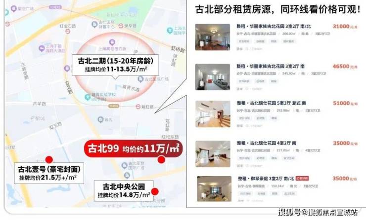 古北二期房龄接近20年,挂牌价格依旧能挺在11-13.5万/㎡;古北中央公园挂牌约14.8万/㎡;价格天花板的古北壹号次新房挂牌价约21.5万/㎡。