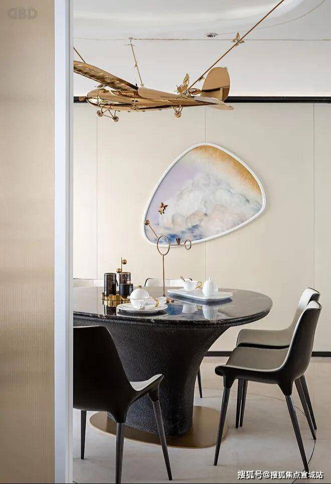 餐厅上面的水晶吊灯被一只飞机模型所在地在光线的照射下,展示出空间当中最独特的空间格调。