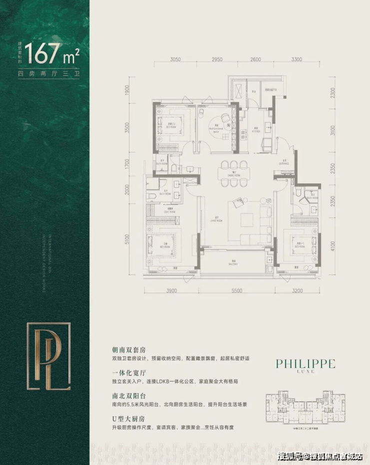 而建面约167㎡则是四房三卫格局, 双套房设计,约40㎡的剧院式横厅,客餐一体,气场全开。市北、滨江的不少改善家庭,都在等它上线。