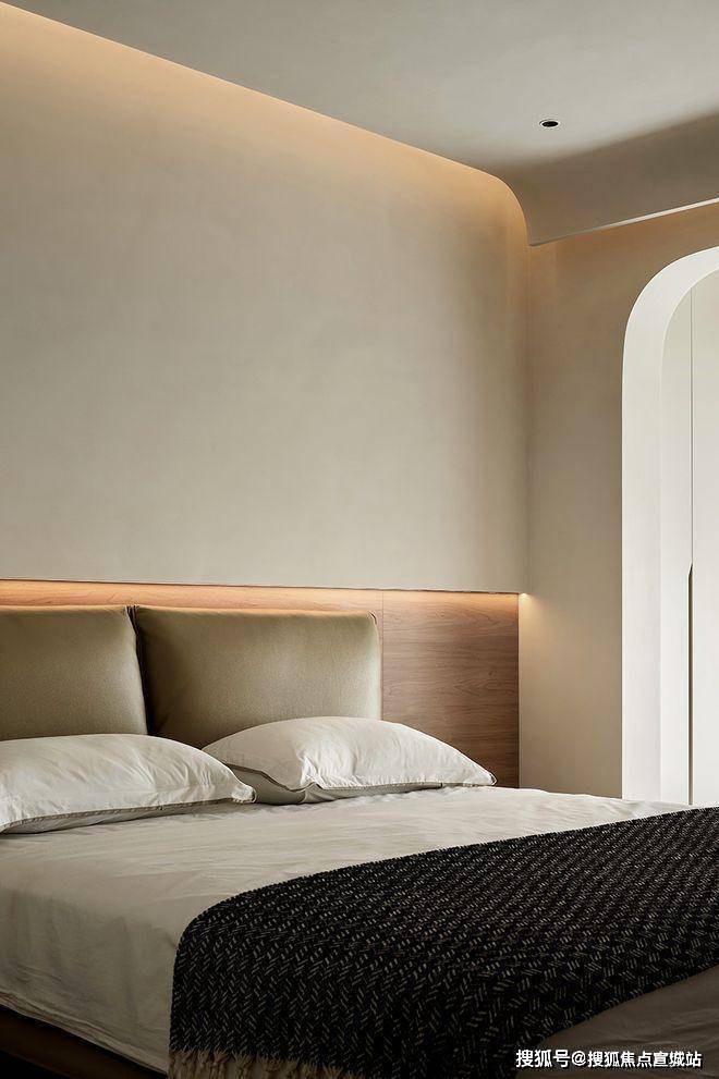 卧室简约且大气,床头背景墙使用板墙木饰面,配合无主灯的暗藏灯带,提升卧室的明亮度和层次感,纵享精神与生活的双重丰盈。