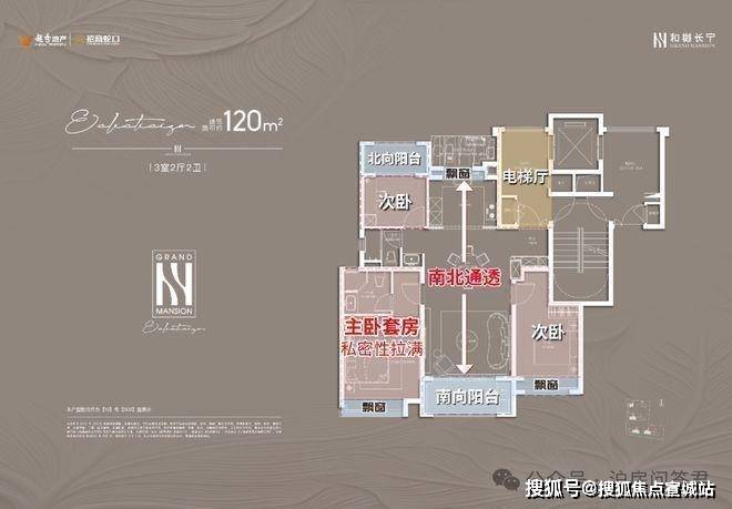 项目建面约120㎡户型也是类独立电梯厅的设计,室内则是标准的南北通透+三开间朝南设计;主卧套房配置,自带卫生间,私密性和舒适度俱佳。