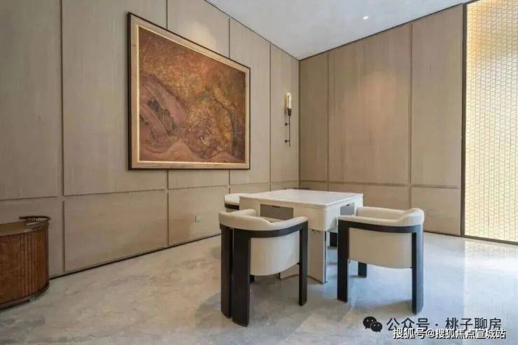 项目园区由北京顺景园打造,共计约3300方的全域景观轴。入口即石材和古铜门板等,用材厚重。