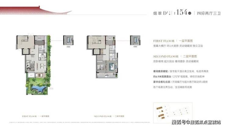 比如建面约170㎡的双层下叠四房两厅三卫,约9.7米面宽,三开间朝南的大四房格局。首层餐厅、客厅、品茶厅三个空间横向舒展,有机组合、互不干扰,单层就撑起了大平层的排场;窗外,还自带一个约9.7米宽的超大花园,满足各种野趣需求;二层是3个房间朝南,奢配约5.6米大阳台,两房联动,舒适自然。