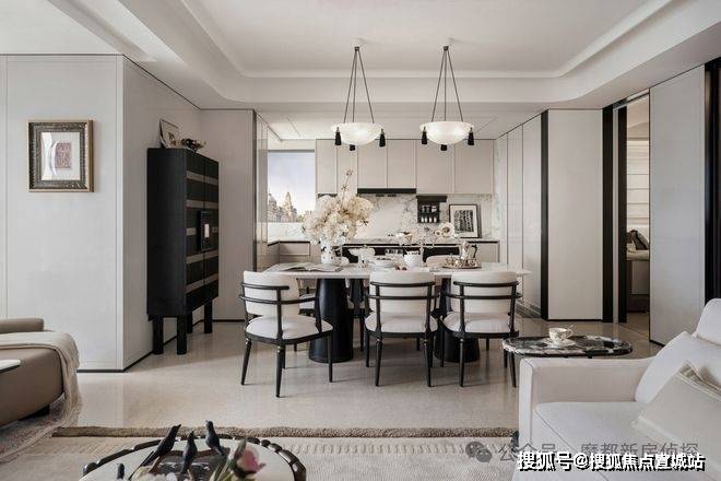 宽境阳台、客餐一体,全域贯通配合香奈儿高奢风,呈现超大尺度家庭公共空间;