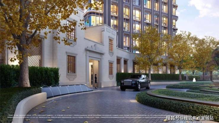 酒店落客式出入口,模纹绿岛 搭配造型灯柱。高奢酒店的礼仪规制和中国传统的门庭礼序相结合,归家仪式感十足