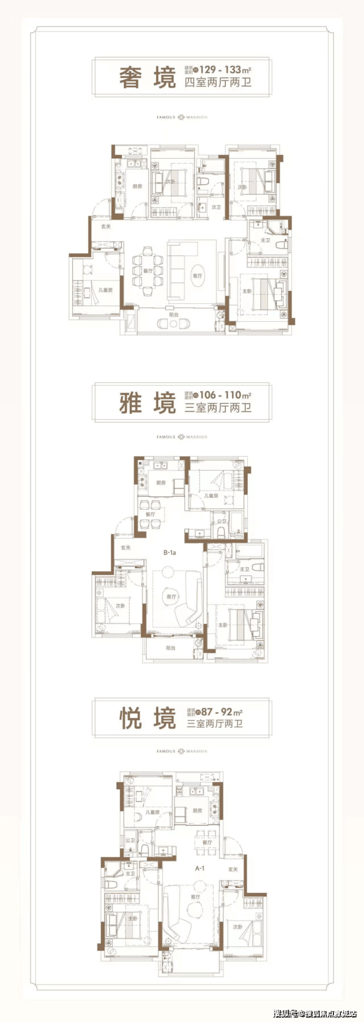 主力户型为建面约 87-133㎡的三至四房,得房率高达 85%。其中,87㎡三房三开间朝南,双卫设计;133㎡四房 6.2 米宽厅连接双阳台,主卧套房配备独立卫浴与步入式衣帽间。