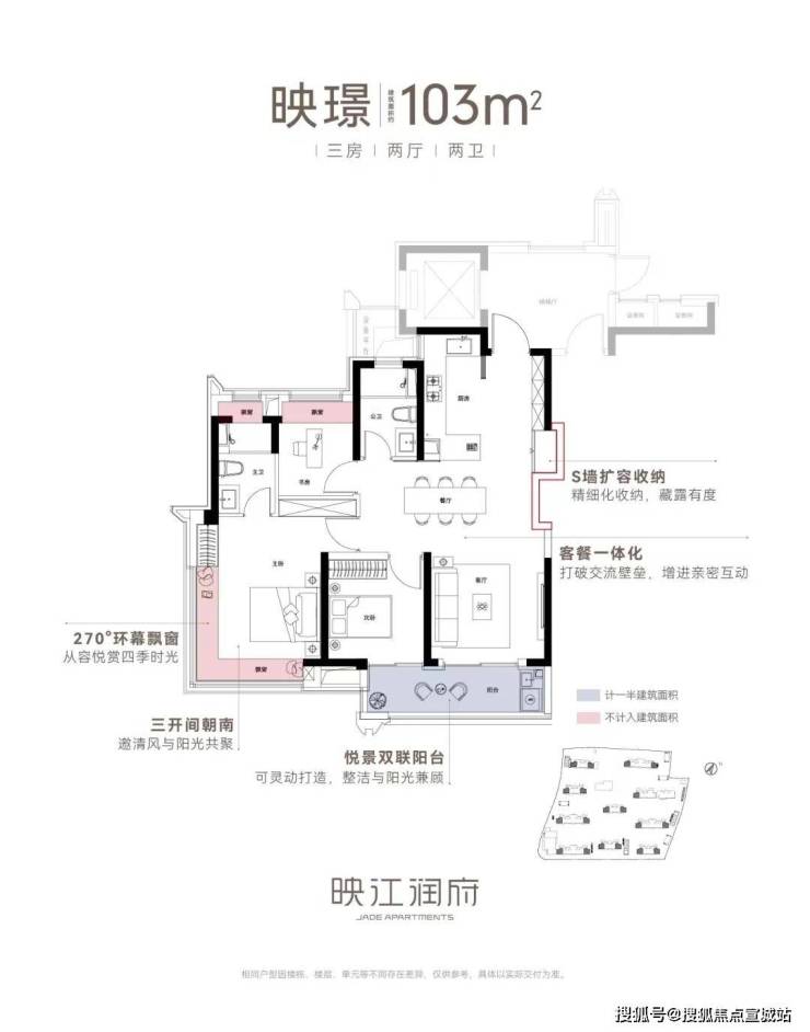 亮点五:双联阳台+多飘窗赠送、灵动空间。映江润府103户型,实现了100平级别难得的双联阳台,实现了室内空间的横向延伸,同时,搭配主卧、主卫、书房的“全飘窗”设计,赋予了空间更多灵动的使用场景。