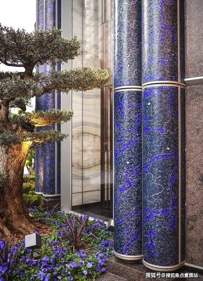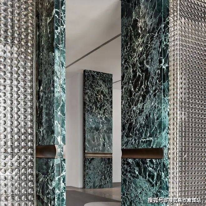 深色柱就选了钻石绿石材,既时尚深邃又具老钱风,与巴西金完美契合。上海普陀-建发海阅首府售楼处电话:400~8558_334