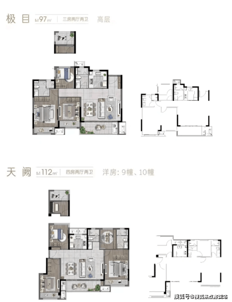 高层:112㎡四居,总价 175 万 - 230 万,7.2 米横厅布局。