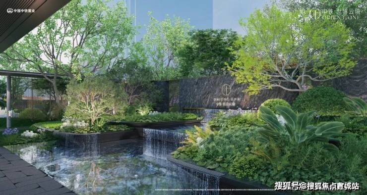 走过虚实结合的格栅与实体墙,映入眼帘的跌水景墙,跌级层次种植池搭配铁冬青乔木,自然花境增添野趣,为业主的归家之路增添几分意趣